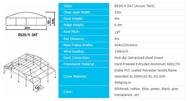 BS20/4-5AT type Arcum tent is adjustable by 5m unit.It can be combination into 20mx20m,20mx25m and 20mx30m, ect. Fashionable and beautiful with graceful arc roof lines, clear span available between 10-40m, modular structure.