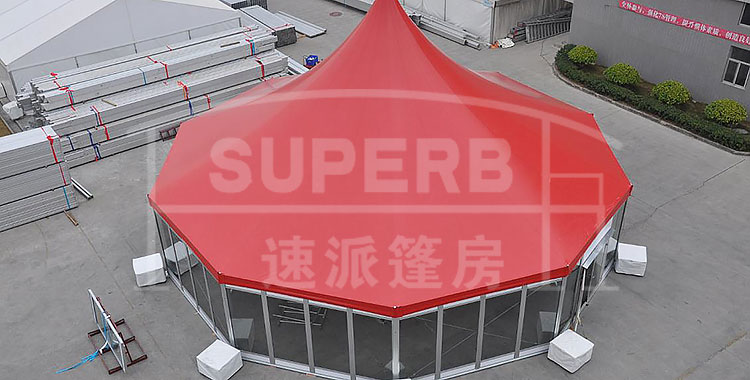 The 20m High Peak Decagonal Event Tent has a eave height of 4m , ridge height of 10.5m and side length of 6.2m. The aluminum main profile is 300x120x5.5/7.5mm. It uses aluminum alloy 6061/T6 (13HW). The Roof covers and sidewalls are made of polyester textile with double PVC layer, which is water proof, UV resistant,and flame retardant according to DIN4102 B1, M2 650-900g/sq.m.