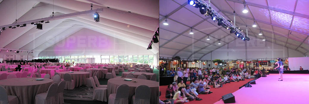 Widely used for temporary outdoor weddings & parties and banquets, festival celebrations, conferences, sports event, trade show, trade fair, advertising and temporary workshops. Specially for outdoor warehouse in the cold areas because of its good performance on the snow load and for the outdoor exhibitions, sports courts because of its higher indoor space.